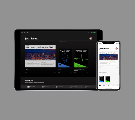 In der neuesten Version der beliebtesten Apple Books Lehrbücher erhalten diese völlig neue Buchcover, welche perfekt zum neuen Design und Dunkelmodus der komplett überarbeiteten App „Bücher“ (ehemals iBooks) in iOS 12 passen. Zudem unterstützen sie jetzt auch das ClassKit Framework für die neue Apple Schoolwork App und sind erstmals mit dem Apple Volume Purchase Programm in Deutschland verfügbar. Physik 7 erhielt zum Start von Apple Books eine besondere Platzierung in der Kategorie Bildung als „preisgekrönter Titel“.